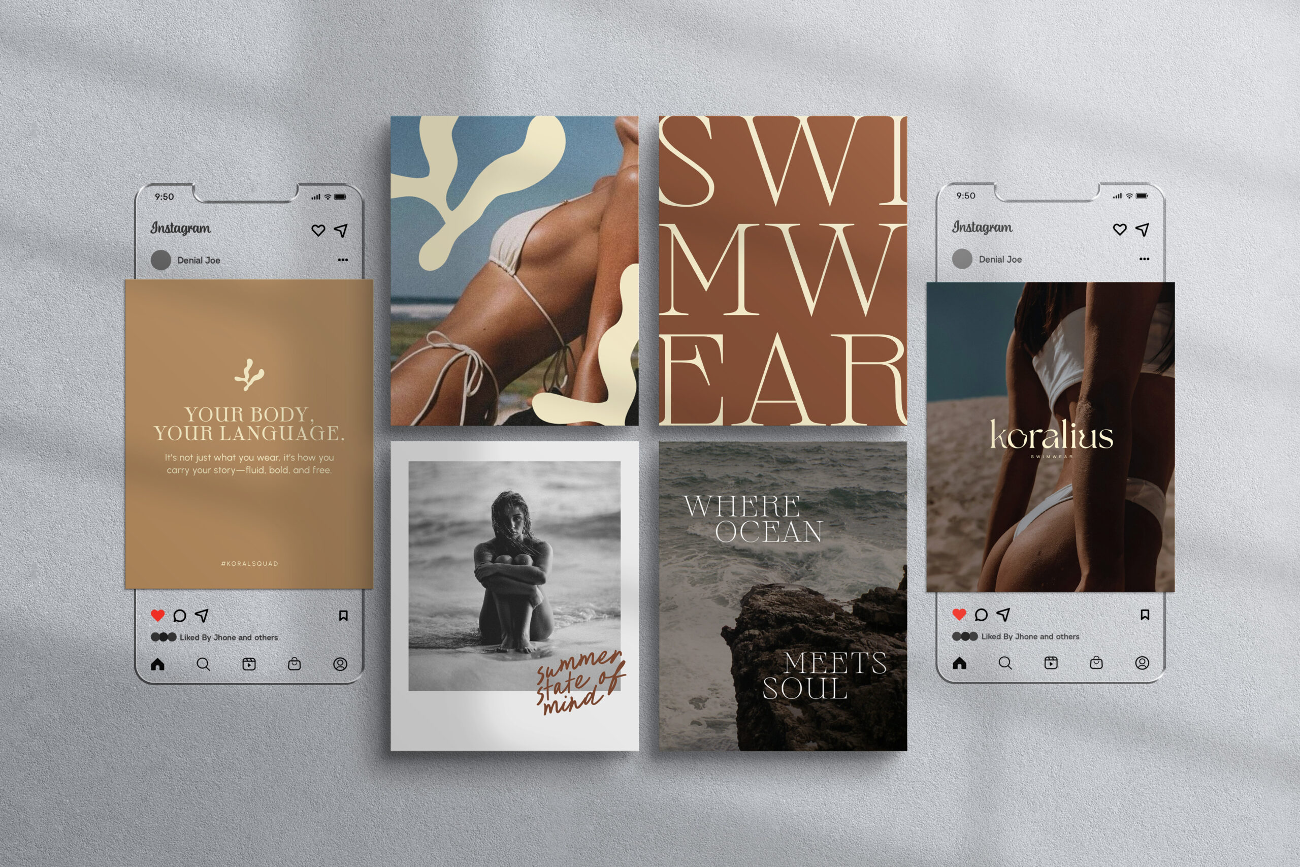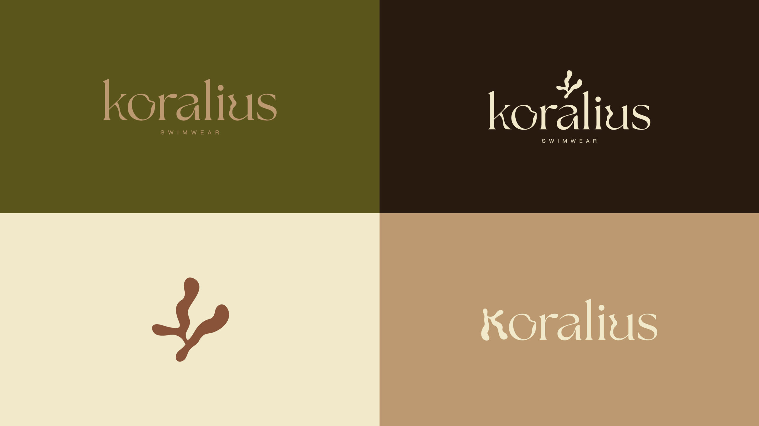 Koralius was born by the sea, inspired by the freedom of the ocean and the organic texture of corals. Its essence balances sensuality and softness—a swimwear brand for women seeking to reconnect with their bodies through natural, understated expression. The branding shaped an identity rooted in this quiet strength, with earthy coastal tones that evoke warmth and timelessness.